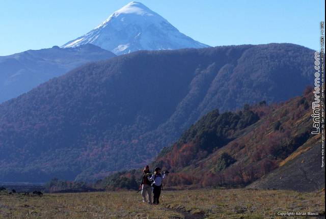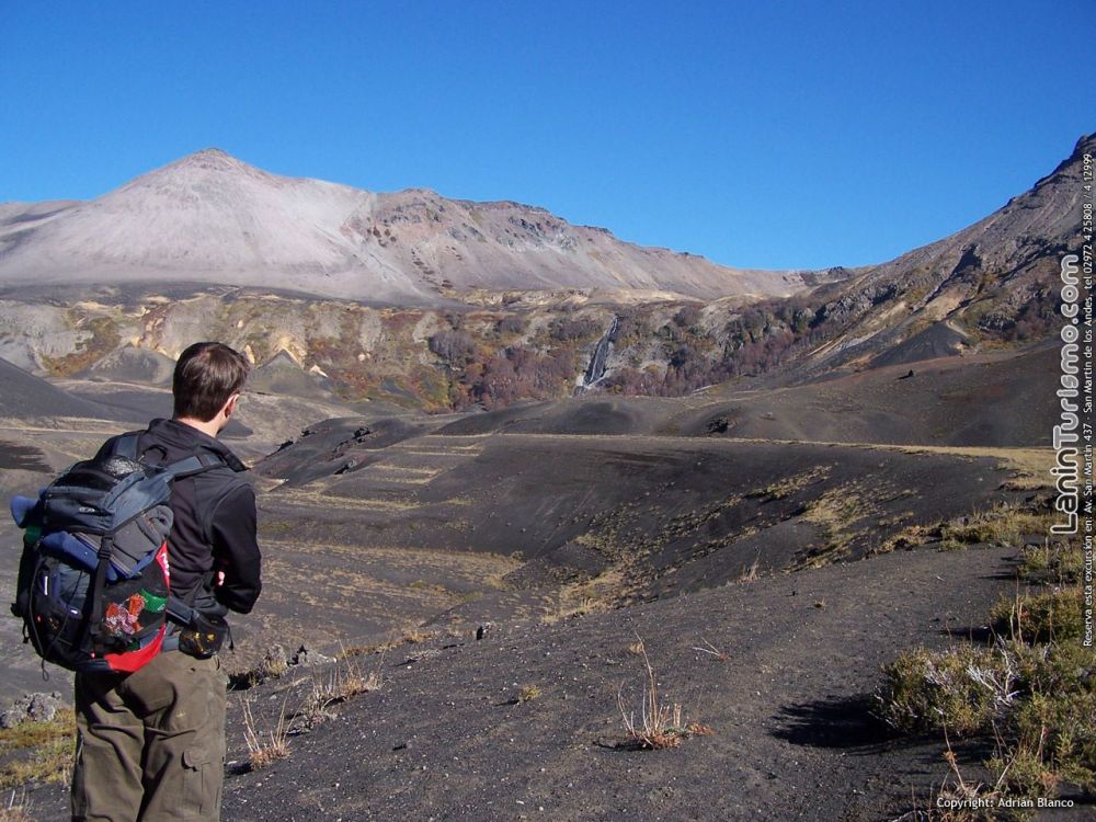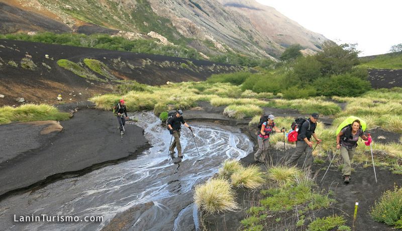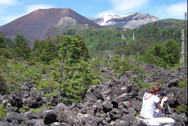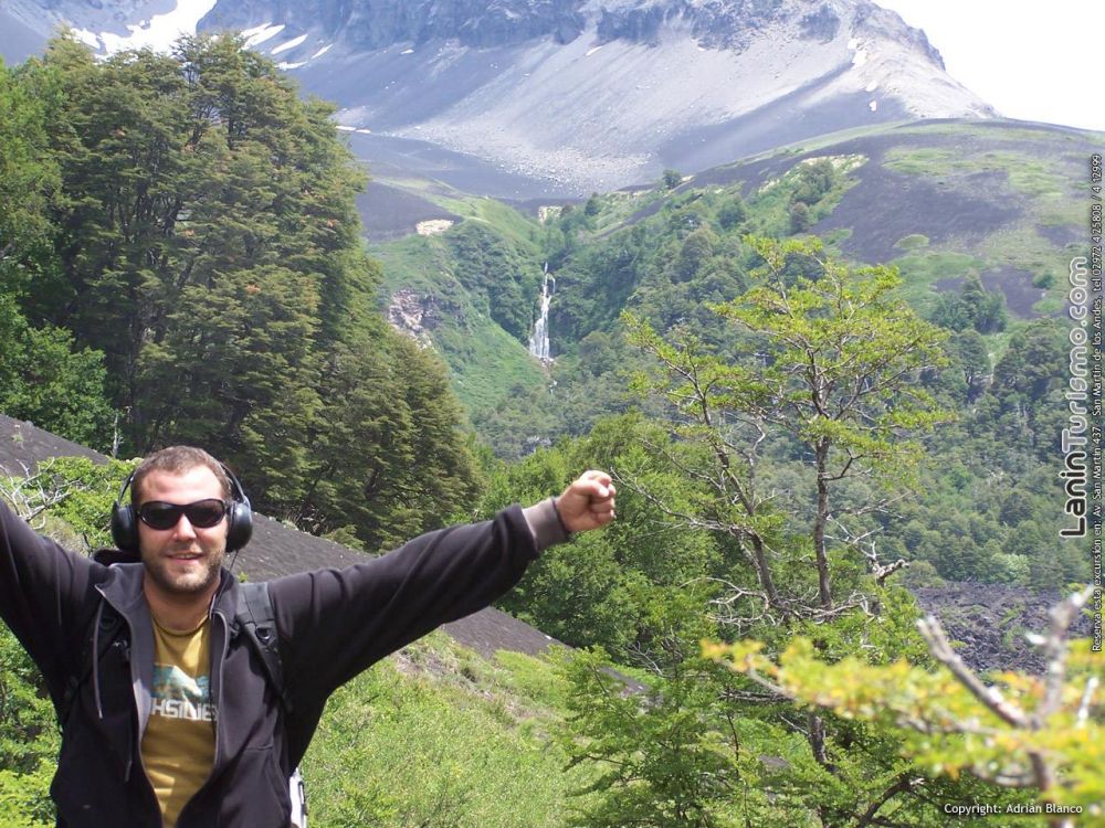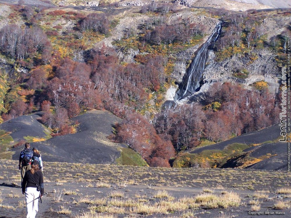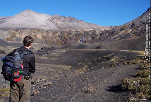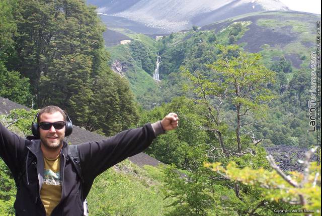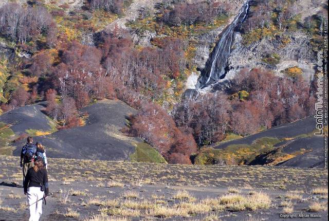 Mientras atravesamos el valle de lava para llegar a la base del volcán, nos dará la bienvenida la cascada de Auquinco, un salto que cual tobogán gigante destaca en el fondo del surrealista valle.