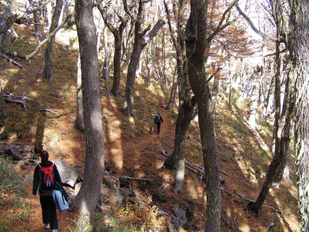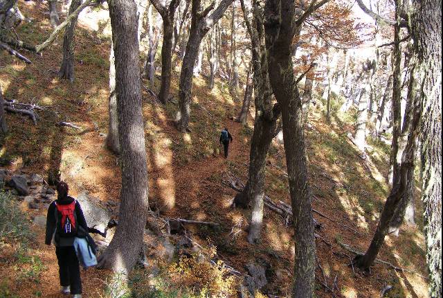 Habiendo empezado a caminar, cruzaremos la pampa que nos acercará hasta la misma base. Bordeando un arroyo comenzaremos ingresando en un gigantesco bosque de lengas con árboles que llegan hasta los 30 mts. de altura y cañaverales de Colihues nos internaremos cada vez mas en un cañadón que nos propone un ascenso no muy exigente pero si constante.